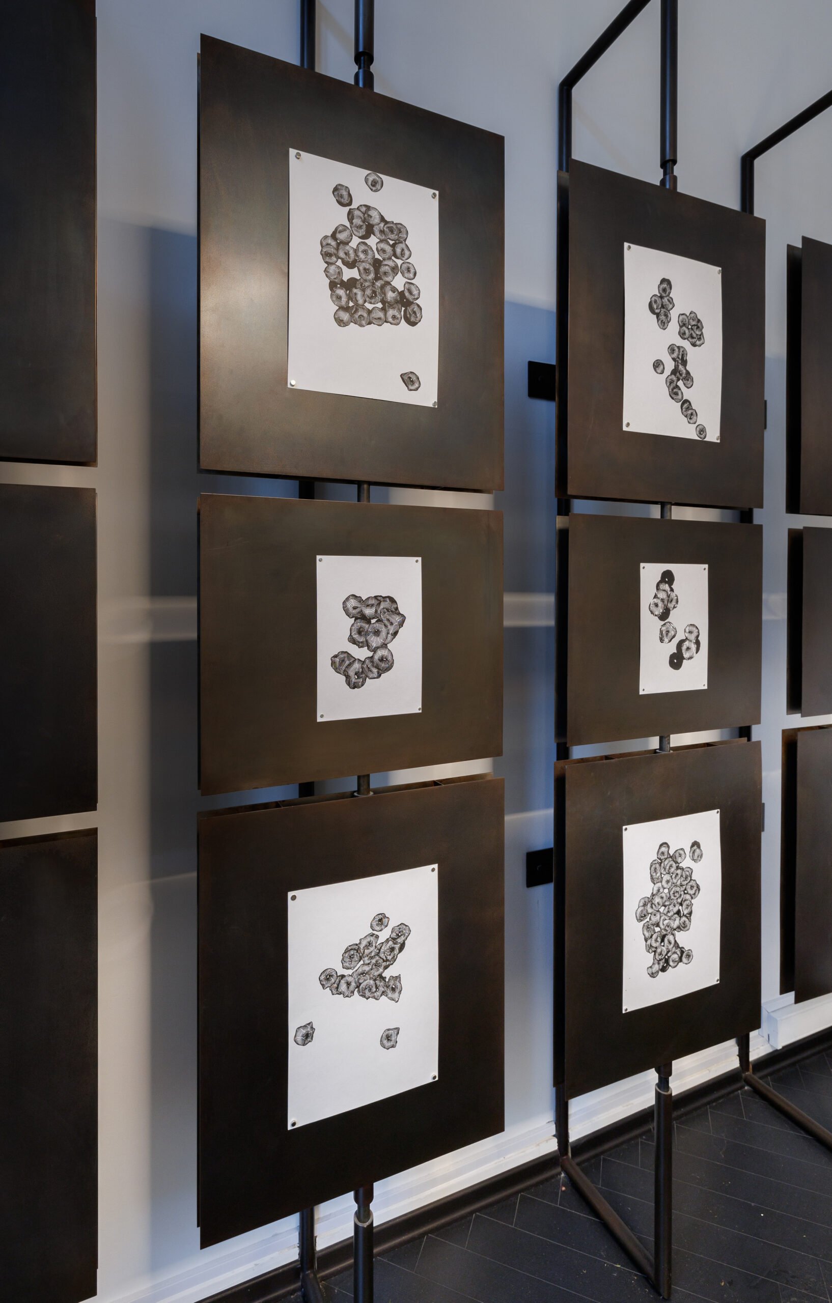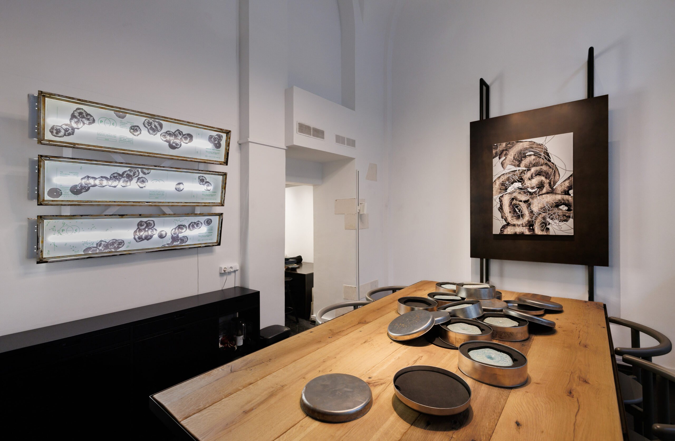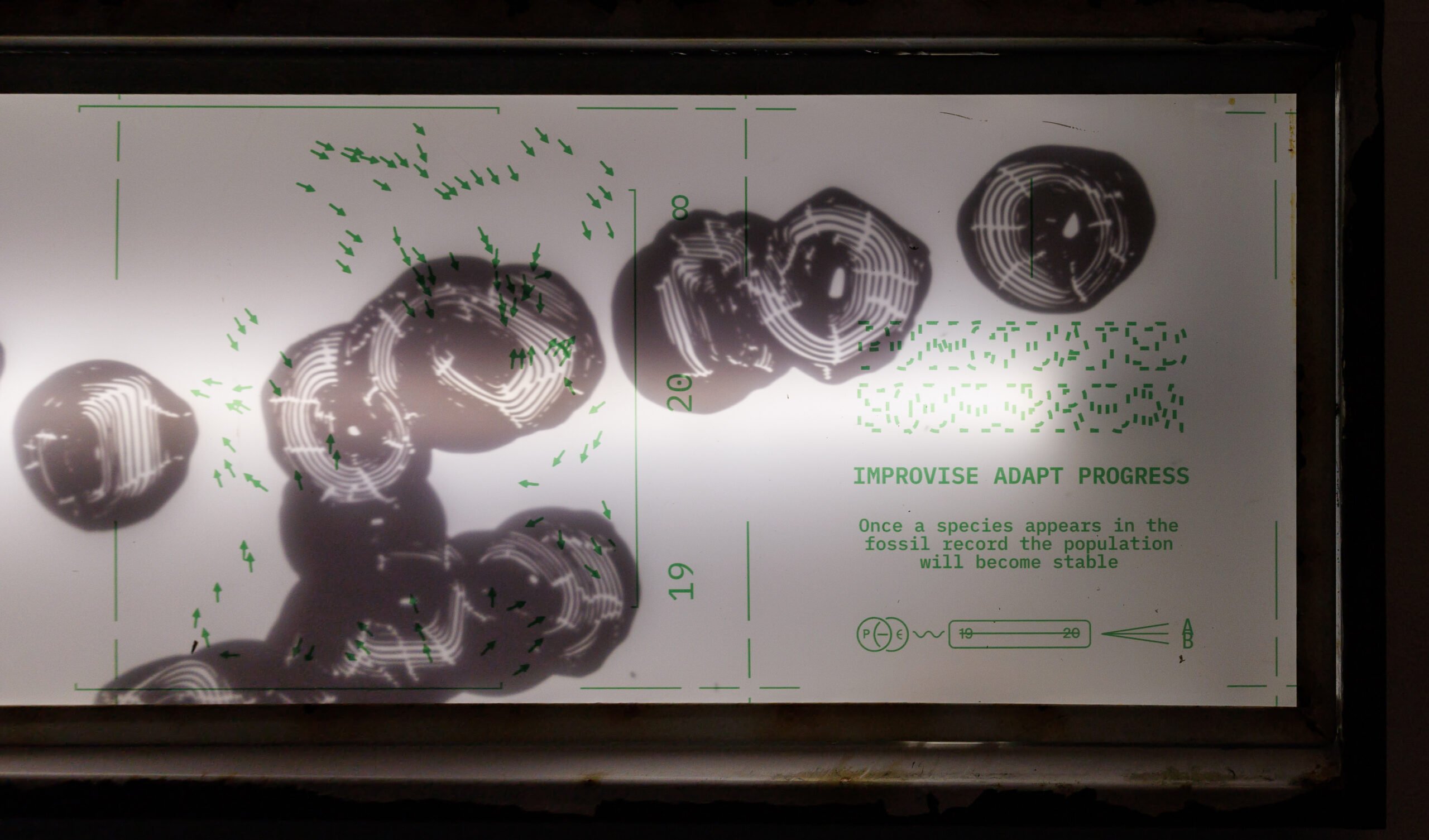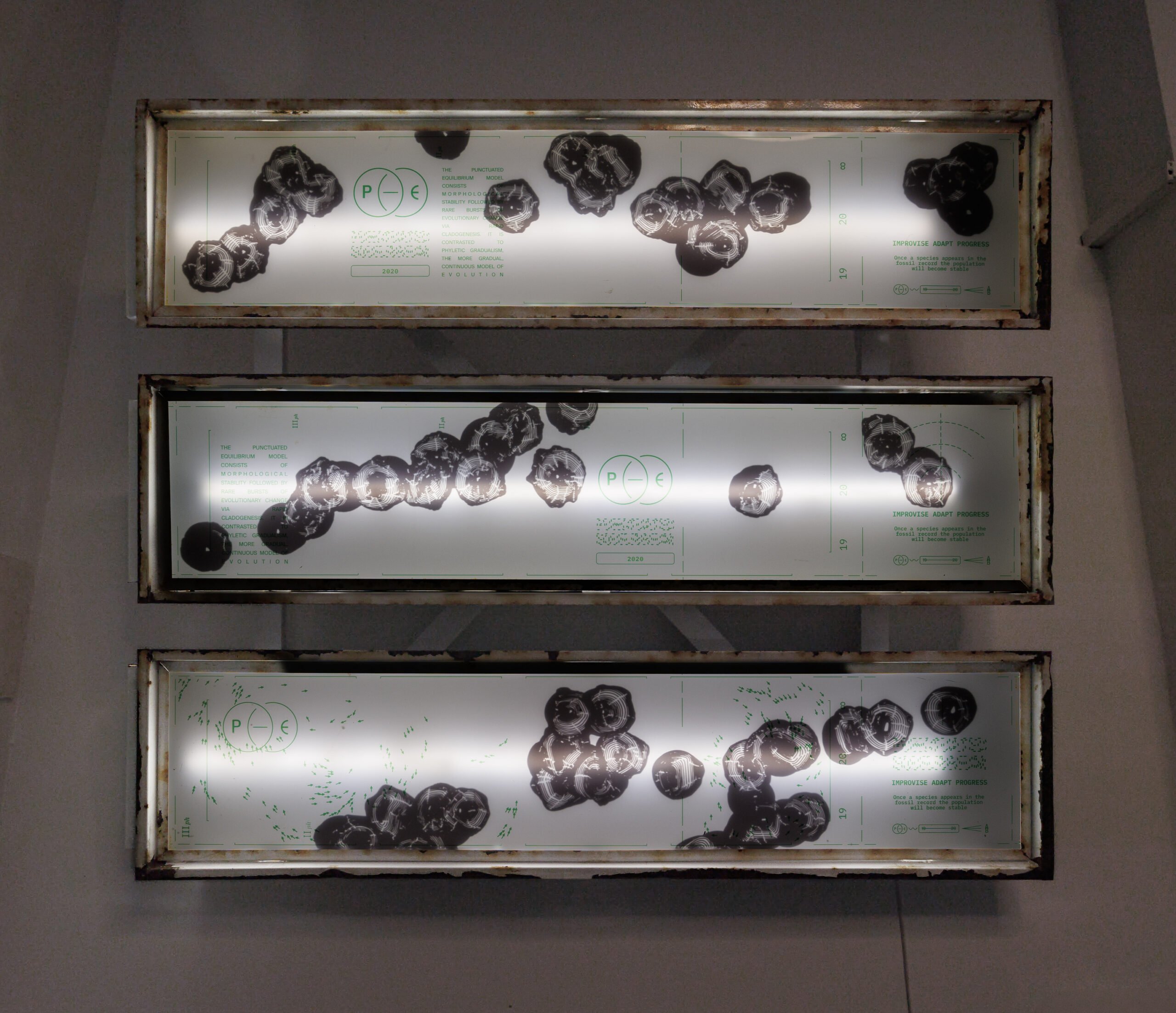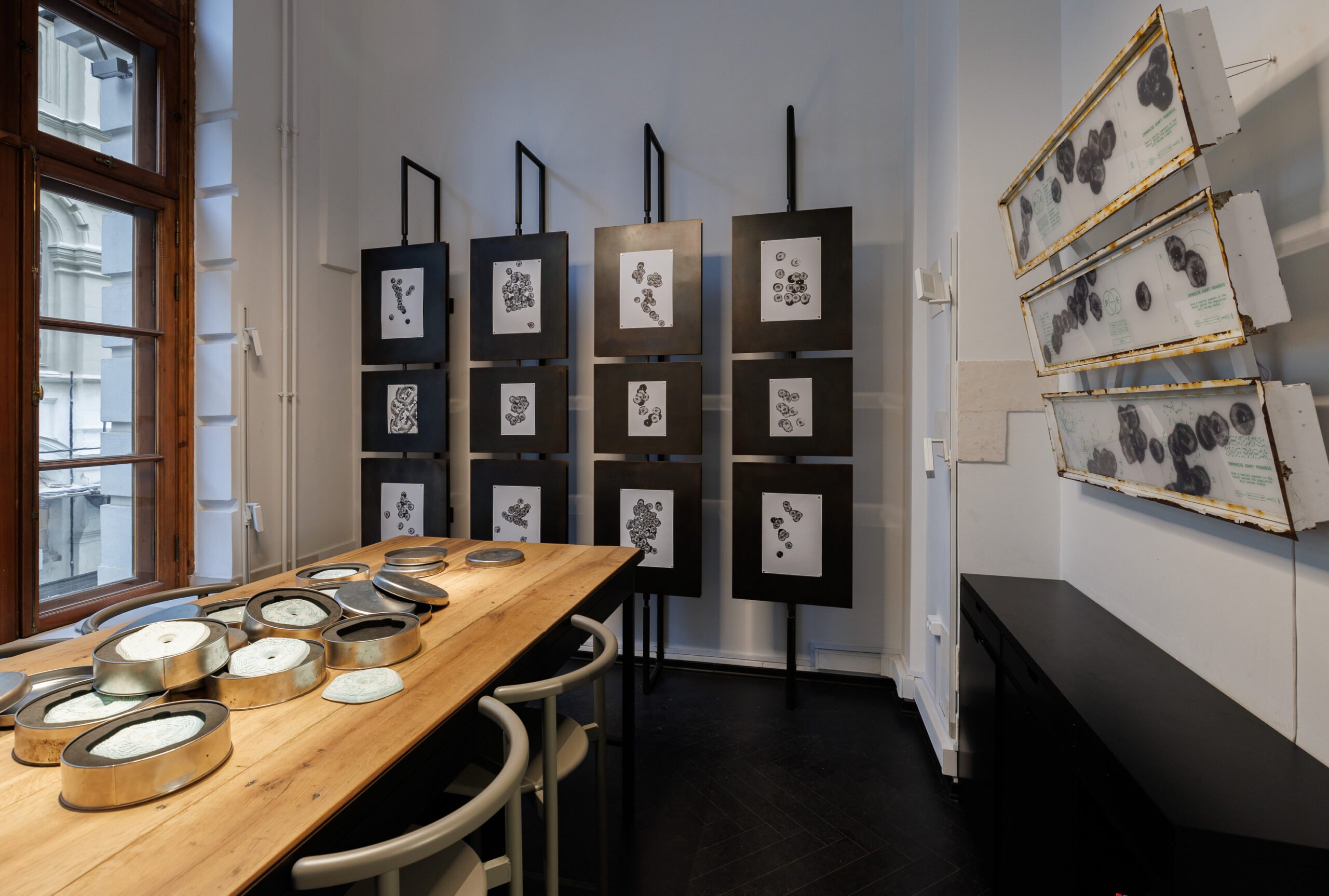 Andrey Berger’s project explores the intermittent nature of evolution, drawing parallels between biological and historical upheavals where collapses lead to sudden, unpredictable transformations. While humanity often rationalizes past disasters, it struggles to foresee future shifts. Unlike typical artistic research, Berger’s approach avoids scientific explanations—his graphic works depict enigmatic biological processes, resembling artifacts from a post-catastrophe lab, leaving interpretation open and emphasizing the mystery of evolutionary and historical change.