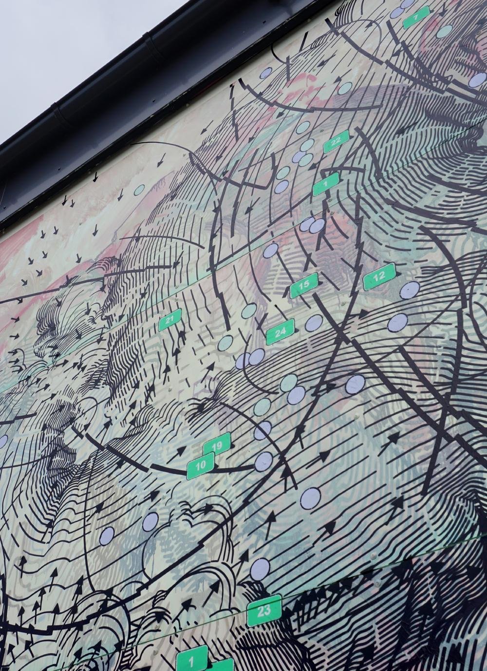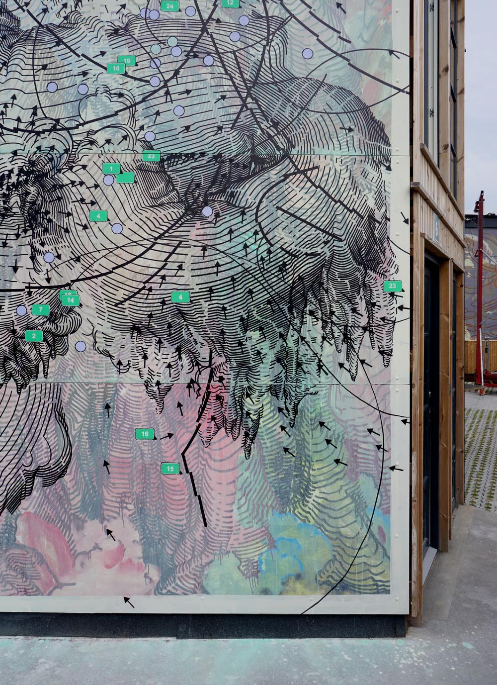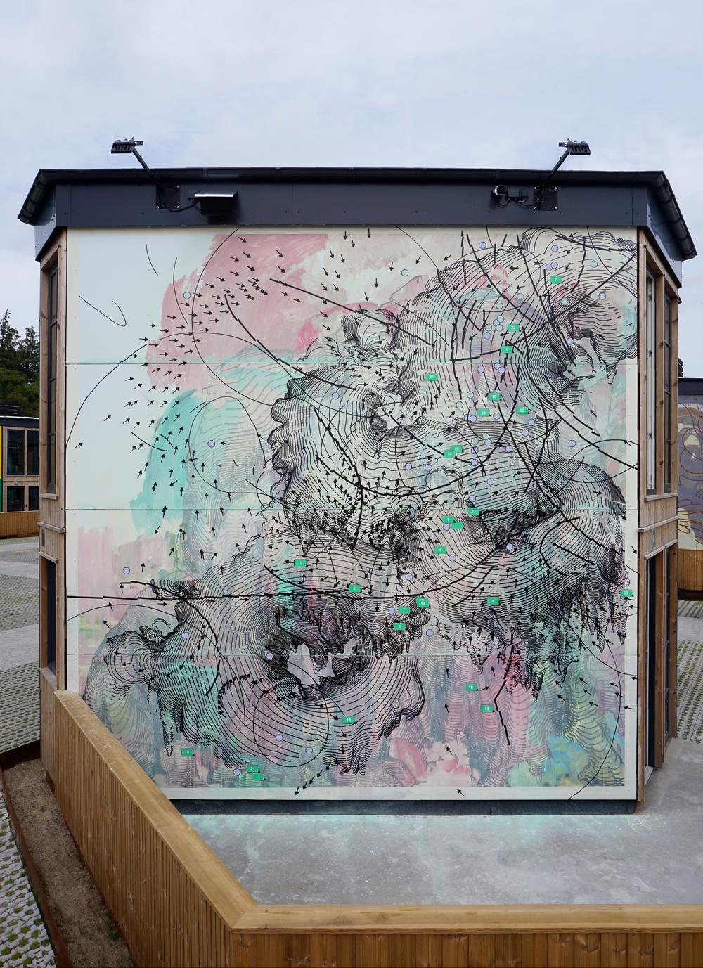 The “Blokhus Mural” by Andrey Berger captures the dynamic interplay between the North Sea and the Danish coast, translating the region’s unique winds, shifting tides, and vibrant natural colors into a layered, evolving artwork. Inspired by coastal meteorology, the piece begins with an organic, cave-like foundation, overlaid with graphic elements of wind patterns, clouds, and sea movements—mirroring the ever-changing forces that shape Blokhus’ landscape. The mural becomes a living reflection of its environment, blending art with the invisible choreography of nature.