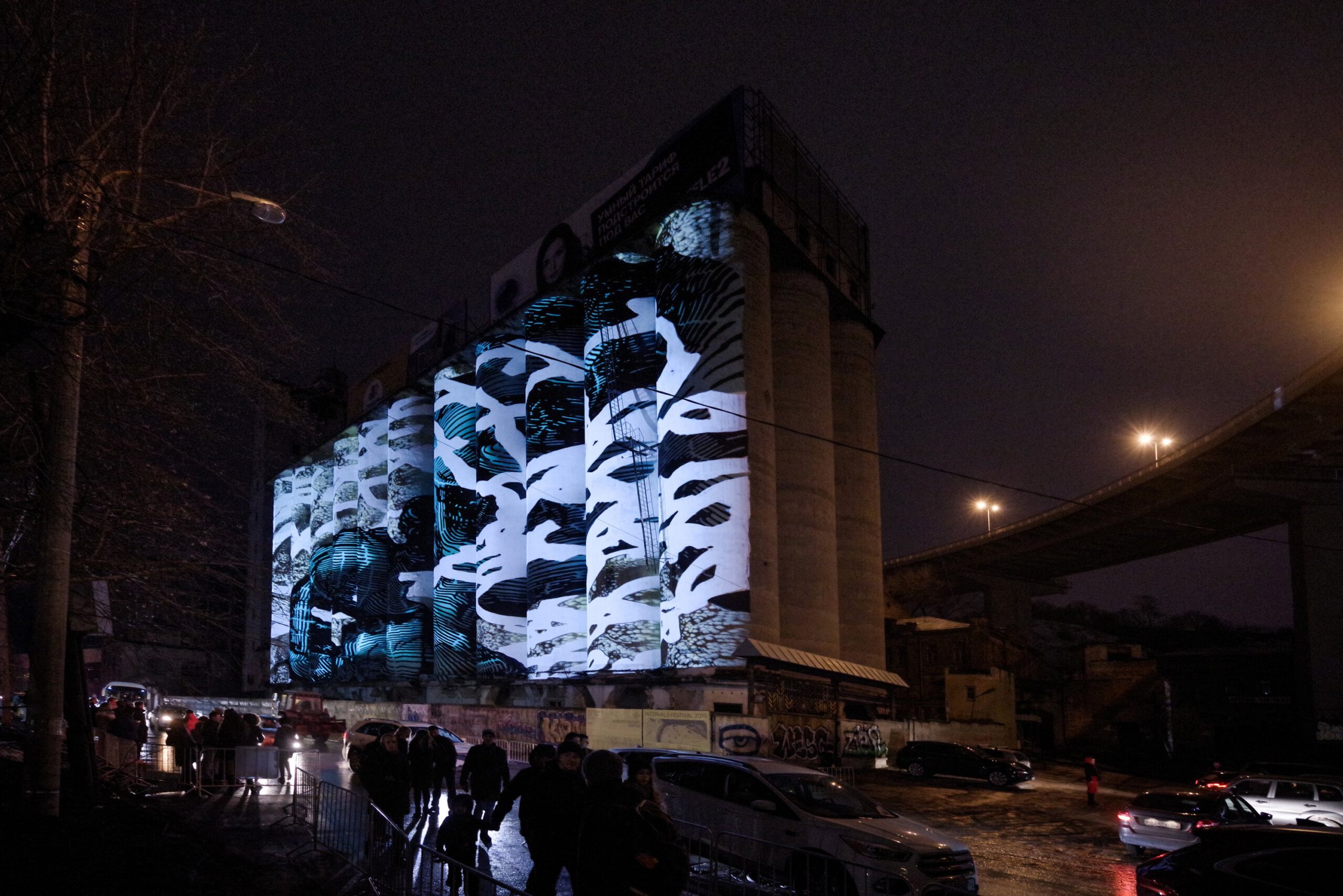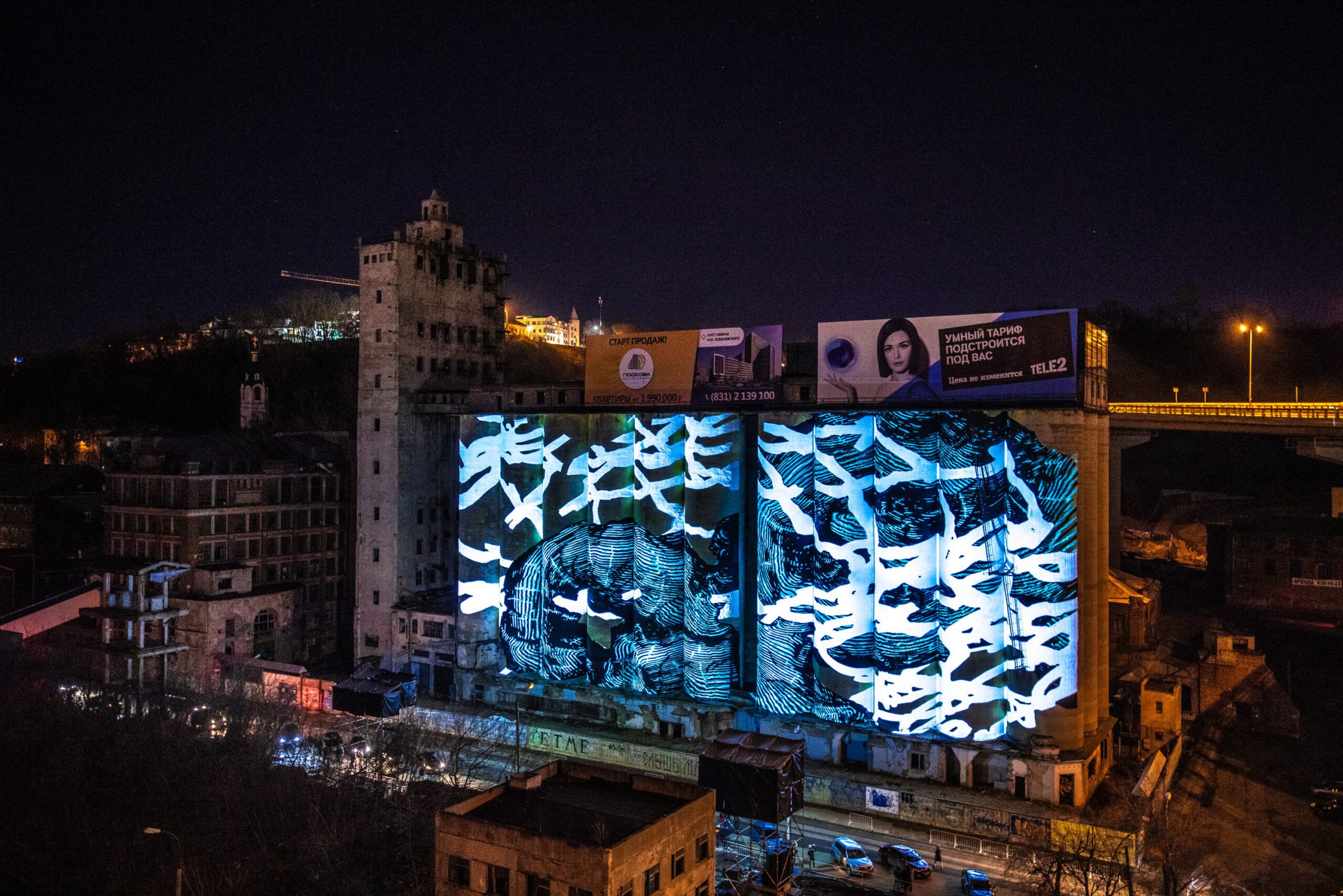I decided to emphasize the connection of the elevator with the river and used an image of a fishing net taken from a photo from the middle of the last century, and also made an audio-visual collaboration with the Dreamlaser team. During the festival, the picture was supplemented with an animated projection using paint-mapping technology.