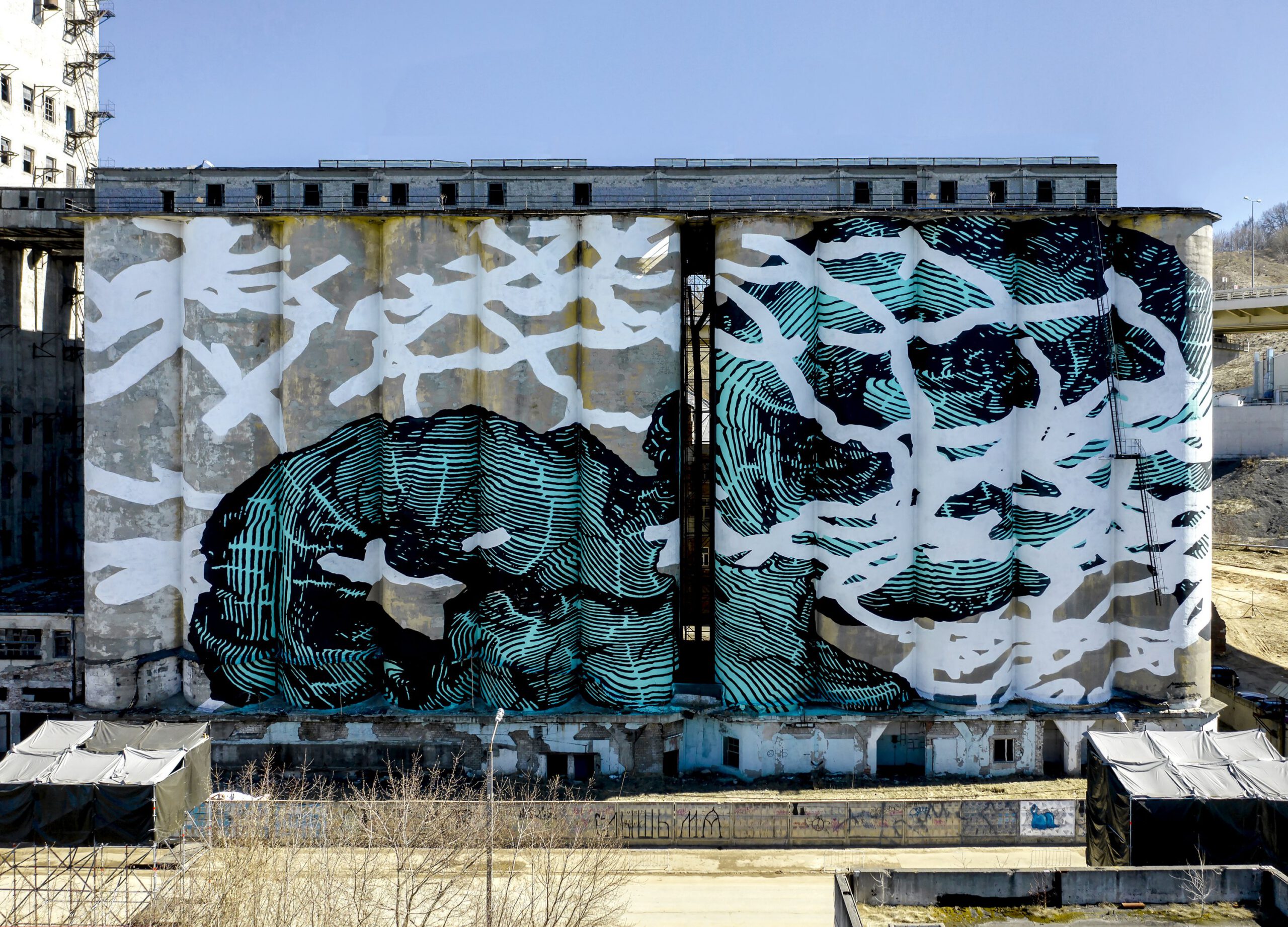 Mural on the building of an abandoned grain elevator of a flour mill.I was inspired by the proximity of the river and the configuration of the space around the factory complex: the building stands at the foot of the high bank of the Oka River in the historical center of Nizhny Novgorod, from the side above it there is a transport interchange and a metro bridge.