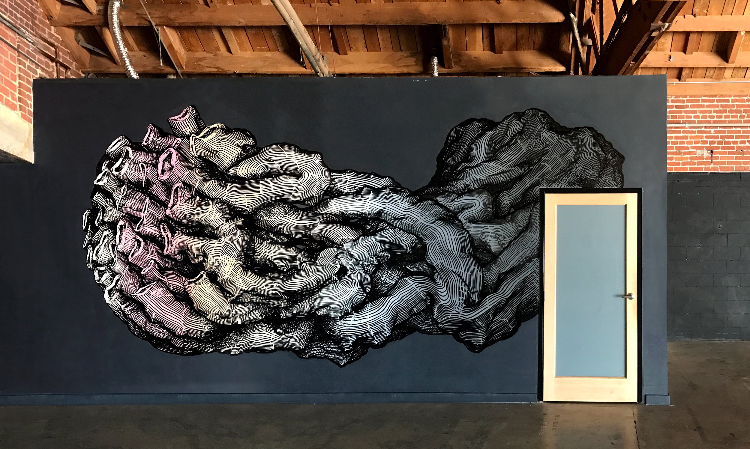 No Name, 2017, Mixed technique (ink, acrylic) on the wall, 300 × 600 cm