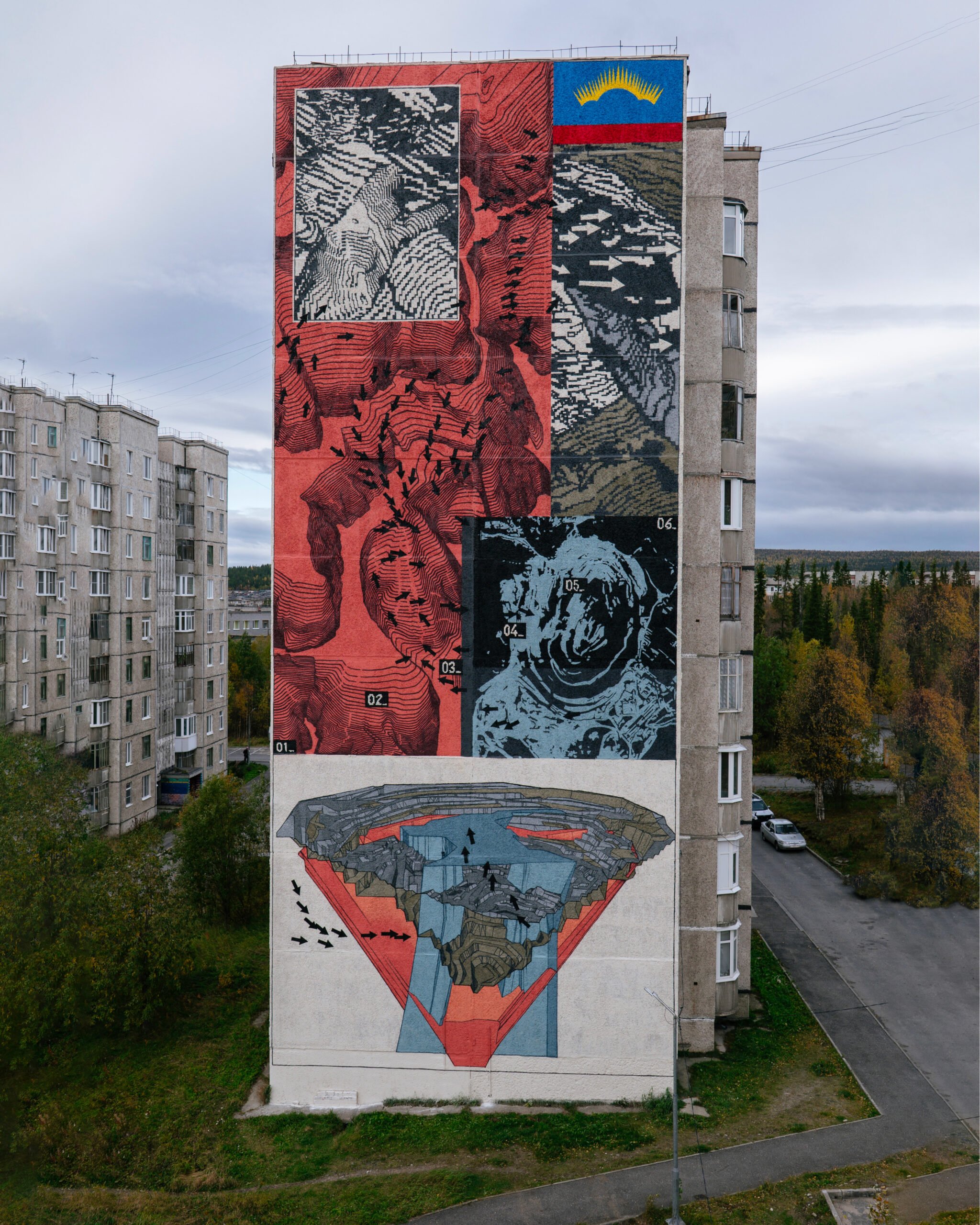 The mural was created beyond the Arctic Circle, in a place where humans literally reshape the Earth’s topography. The city lives by the rhythm of the mining and processing plant, around which an artificial landscape has grown: open pits, tailings, technogenic hills, and reservoirs. Here, the boundary between nature and industry disappears.