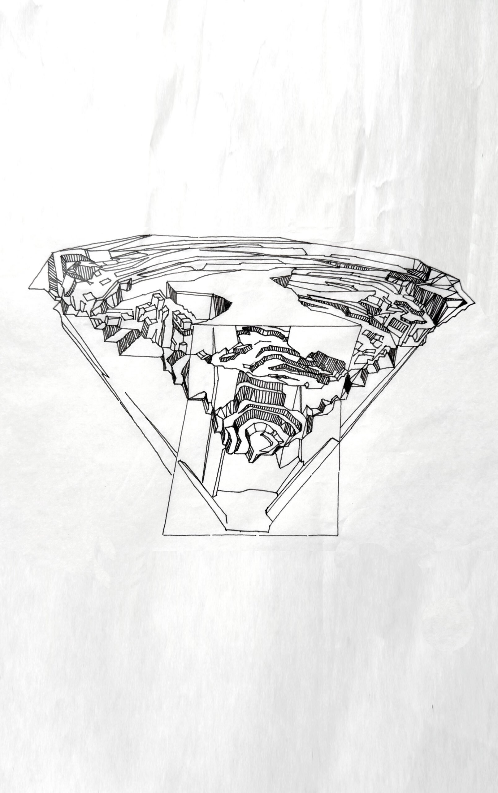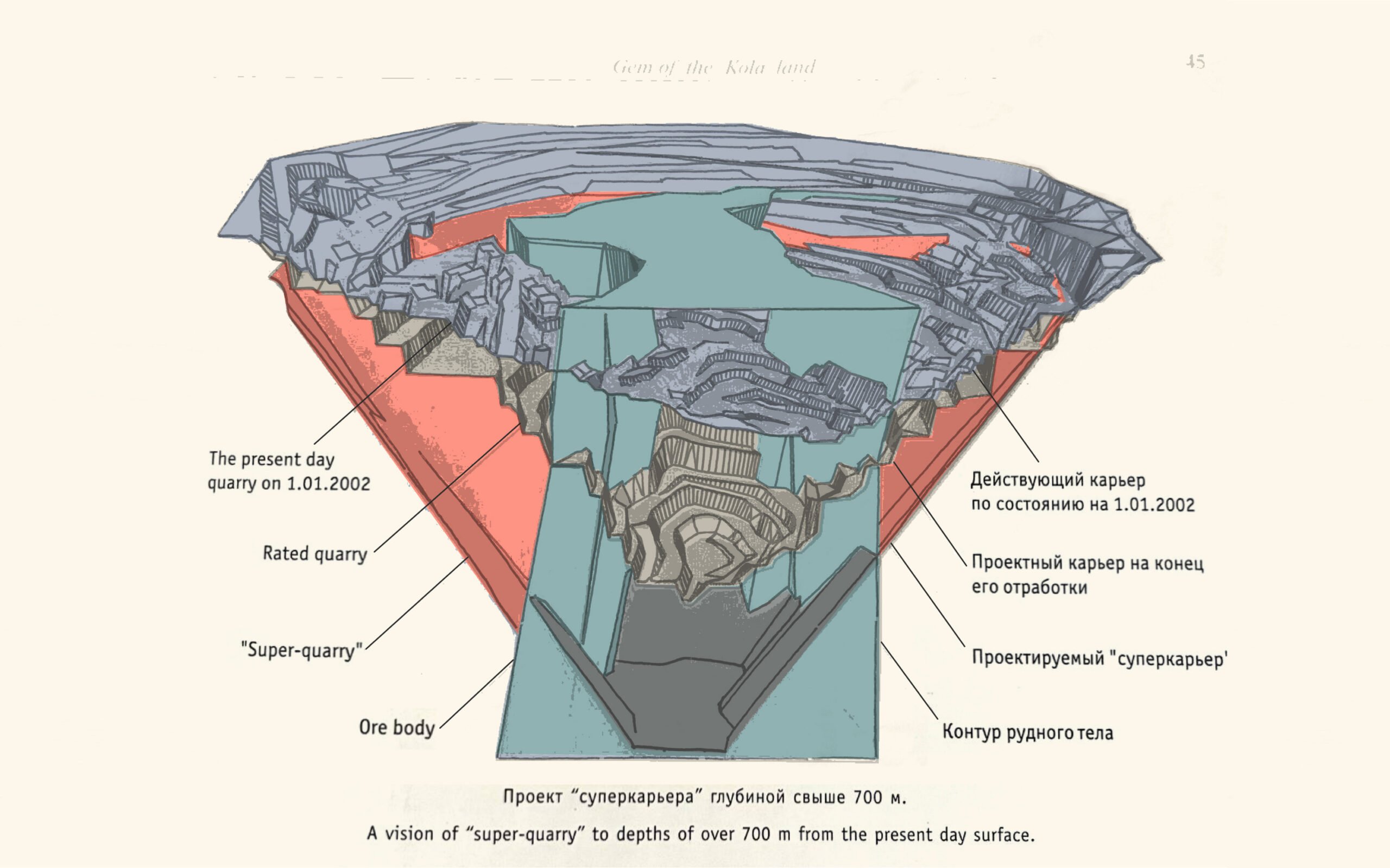 The central motif is the vision of the future “Superquarry,” which by mid-century will reach a depth of about 700 meters. This crater, visible from space, becomes a metaphor for the interaction between humans and the planet—a collision of timescales: the instant of human activity against millions of years of geological processes.