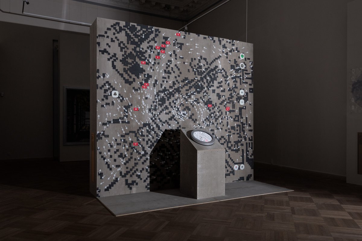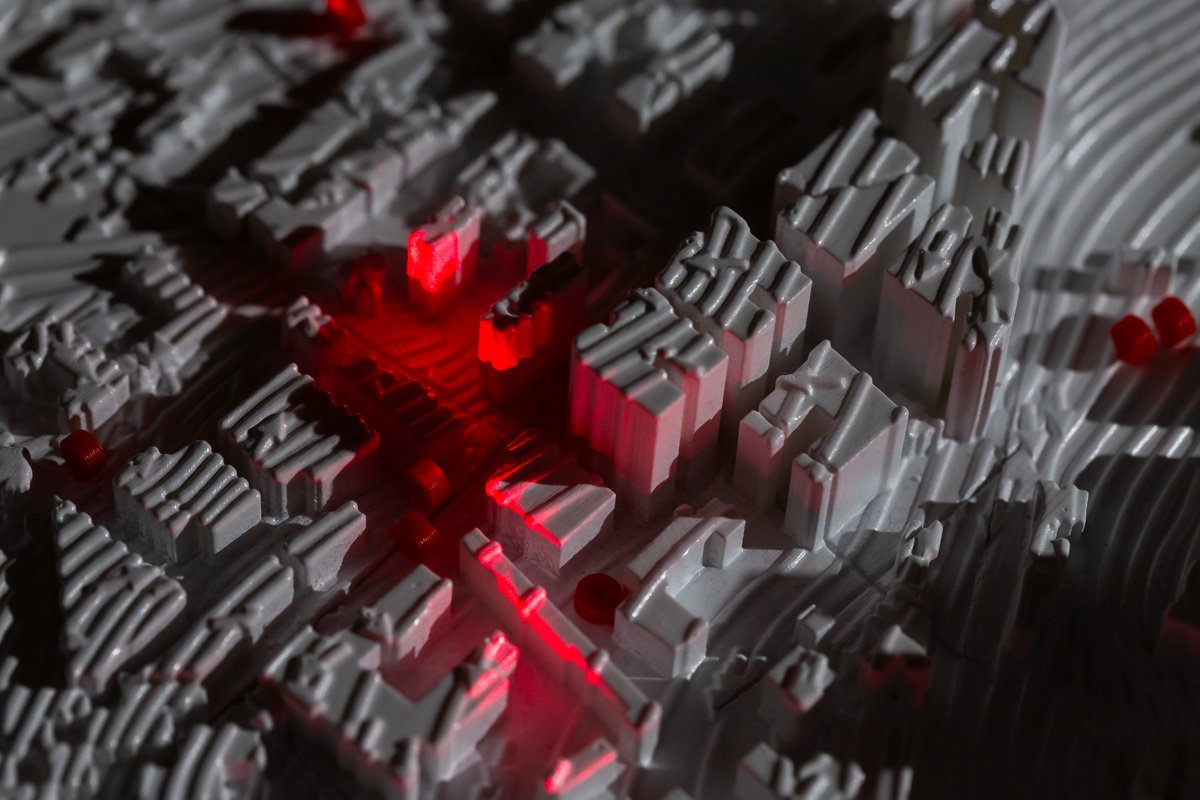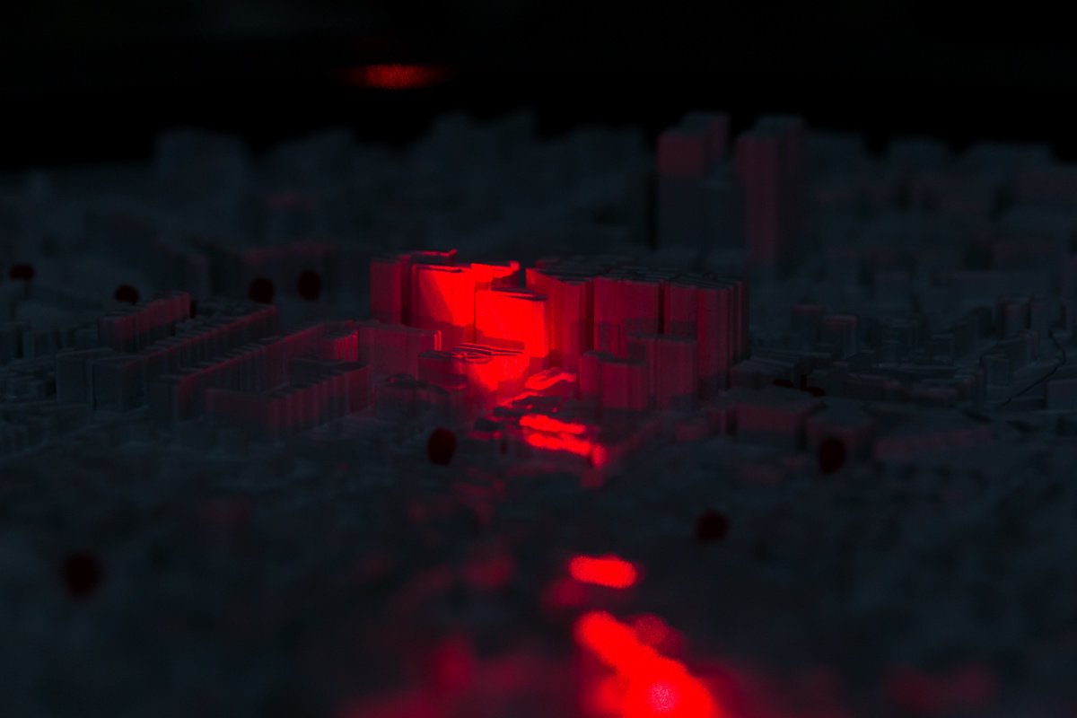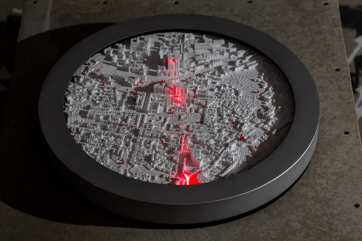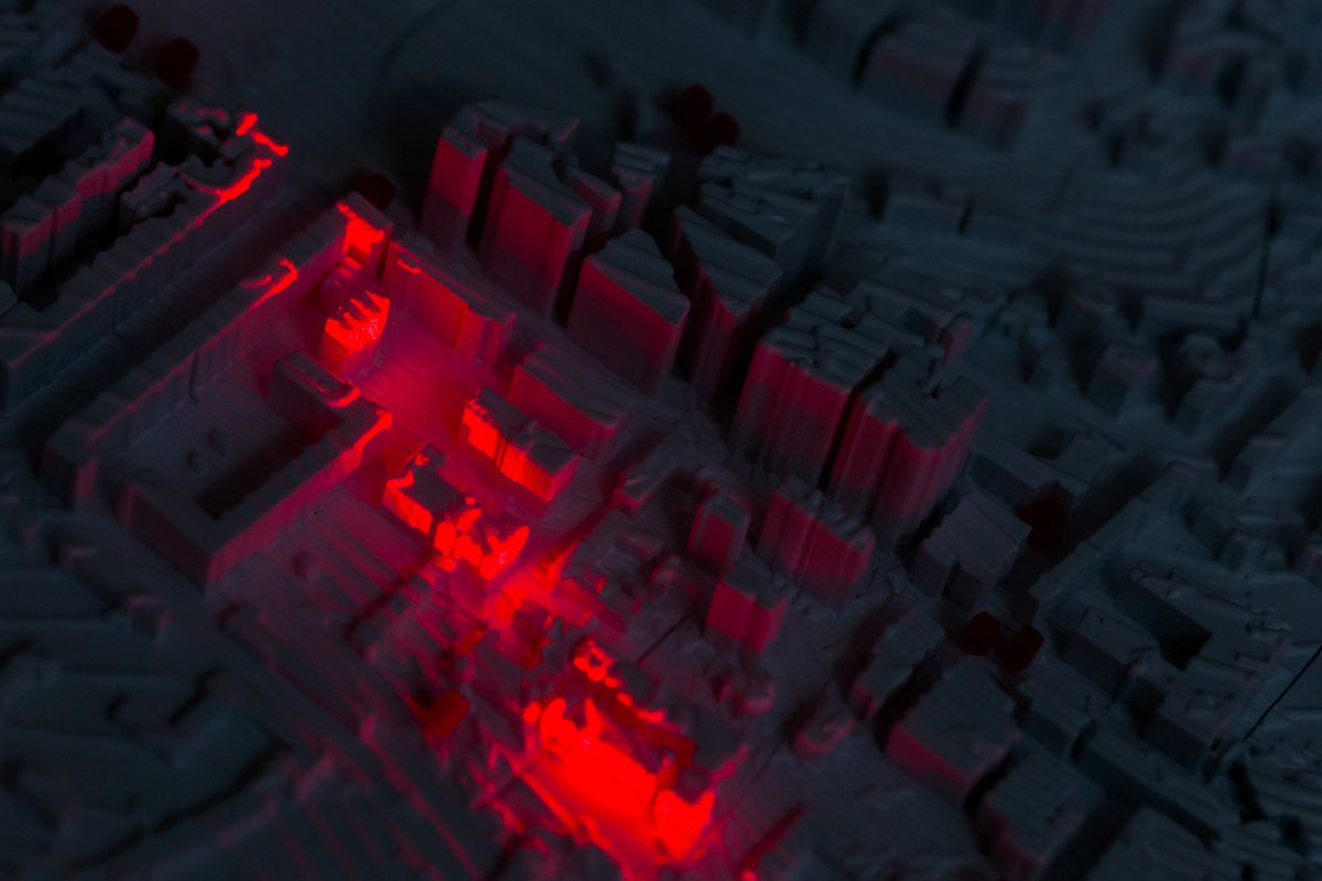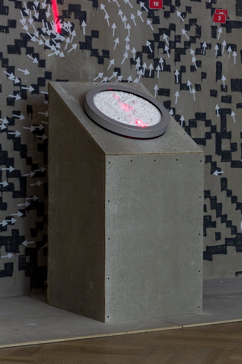 Alas — is a moving three-dimensional model of Moscow’s central district. The object was composed of electronic stuffing, a laser scanning beam, 3D printing, and was included in the installation.